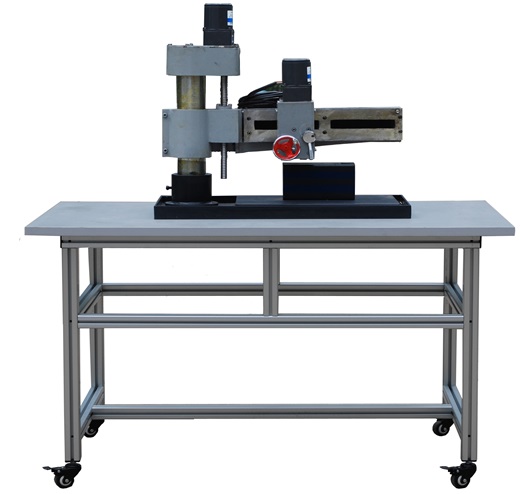 智能型四合一機床半實物仿真模型放置在工作桌上。智能型四合一機床半實物仿真模型是參照智能型四合一機床的尺寸按照一定比例縮小設計;半實物機床上所有電氣元件電壓等級與實際的機床完全相同;半實物機床的床身采用鑄件;滾軸絲杠傳動;手輪使用實際機床部件,貼近真實機床;機床活動導軌表面采用高頻淬火工藝,經久耐用。