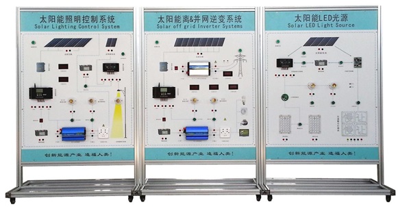 光伏發(fā)電系統(tǒng)集成演示版,主要由A、B、C三塊主模板組成。A 太陽能照明控制系統(tǒng)演示模板、B 太陽能離&并網(wǎng)逆變系統(tǒng)演示模板、C 太陽能LED光源系統(tǒng)演示模板。