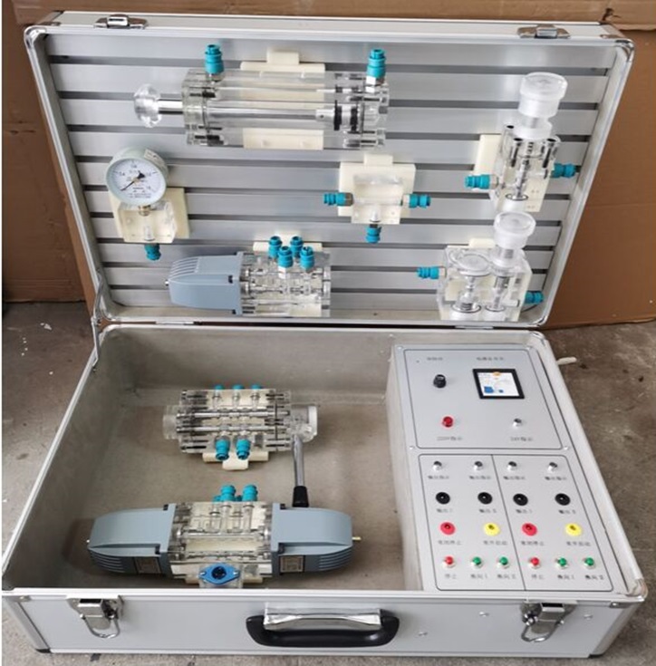 2.液壓元件采用透明有機(jī)玻璃加工的閥體,閥芯結(jié)構(gòu)及動(dòng)作狀態(tài)均可清晰可見,系統(tǒng)用油專門采用工業(yè)紅色液壓油,系統(tǒng)運(yùn)行時(shí)可清晰觀察到液體的流向及液壓元件閥芯的工作過程。